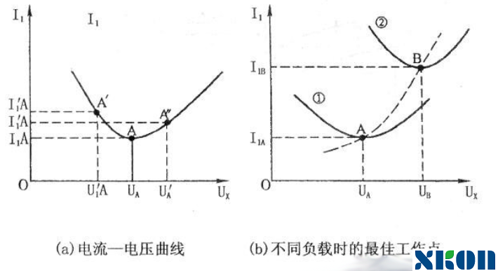 所以,电流和电压的关系曲线呈U形,存在着一个最佳工作点,如下图a)中之A点。转速变化时,最佳工作点也将转移,如下图b)所示。